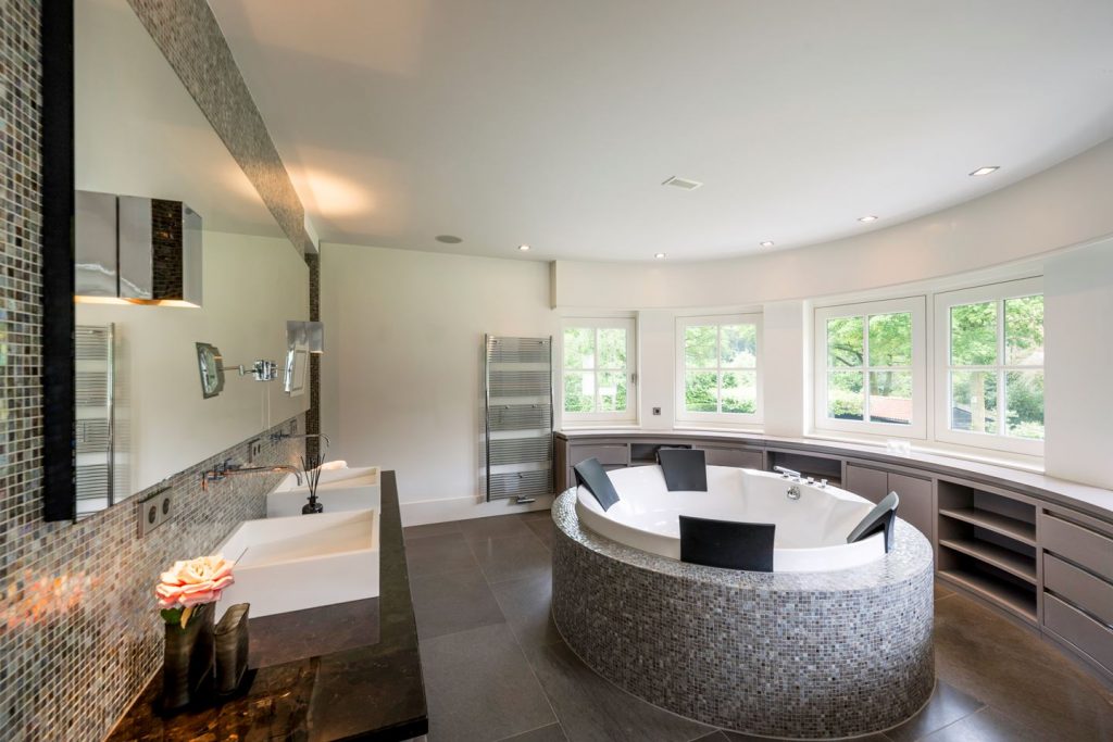 Op de eerste verdieping gaat de verwennerij zoals op de begane grond moeiteloos door. De zachte lichtgrijze vloerbedekking leidt ons naar de eerste slaapkamer van het huis. Deze is royaal opgezet en beschikt zelfs over een moderne inloopkast. Als je in deze kamer je kleding niet kwijt kan, ben je pas echt koopziek. Er is ruimte voor minstens honderden schoenen, tassen en andere designerkleding die de eigenaar van een landhuis hoort te dragen. Naast deze kamer treffen we een luxueuze badkamer, waar een bijzonder ligbad is neergezet. Dit soort taferelen komen we doorgaans enkel in de Spa tegen, maar voor deze miljoenenvilla is helemaal niets te gek. De royale inloopdouche is volledig versierd met piepkleine steentjes in allerlei kleuren. Zo waan je jezelf even in een discotheek tijdens het douchen.
