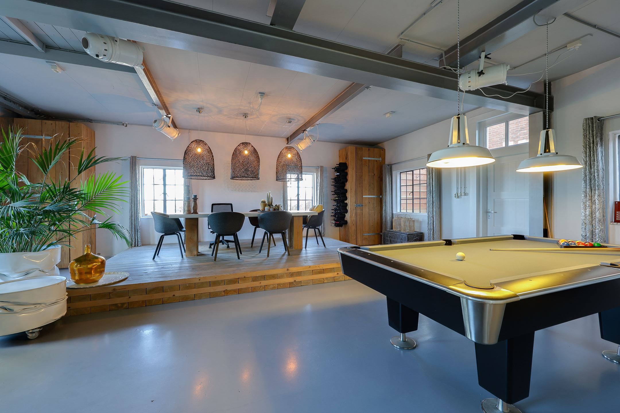De ruimte aan de voorzijde, voorheen een atelier, is omgebouwd tot een coole en industriële werk- en ontspanningsruimte. Hier vind je een pooltafel, een gezellige tv-hoek en een grote eettafel op een verhoging. Deze ruimte, liefkozend de “borrelschuur” genoemd, is perfect voor gezellige feestjes en borrels.
