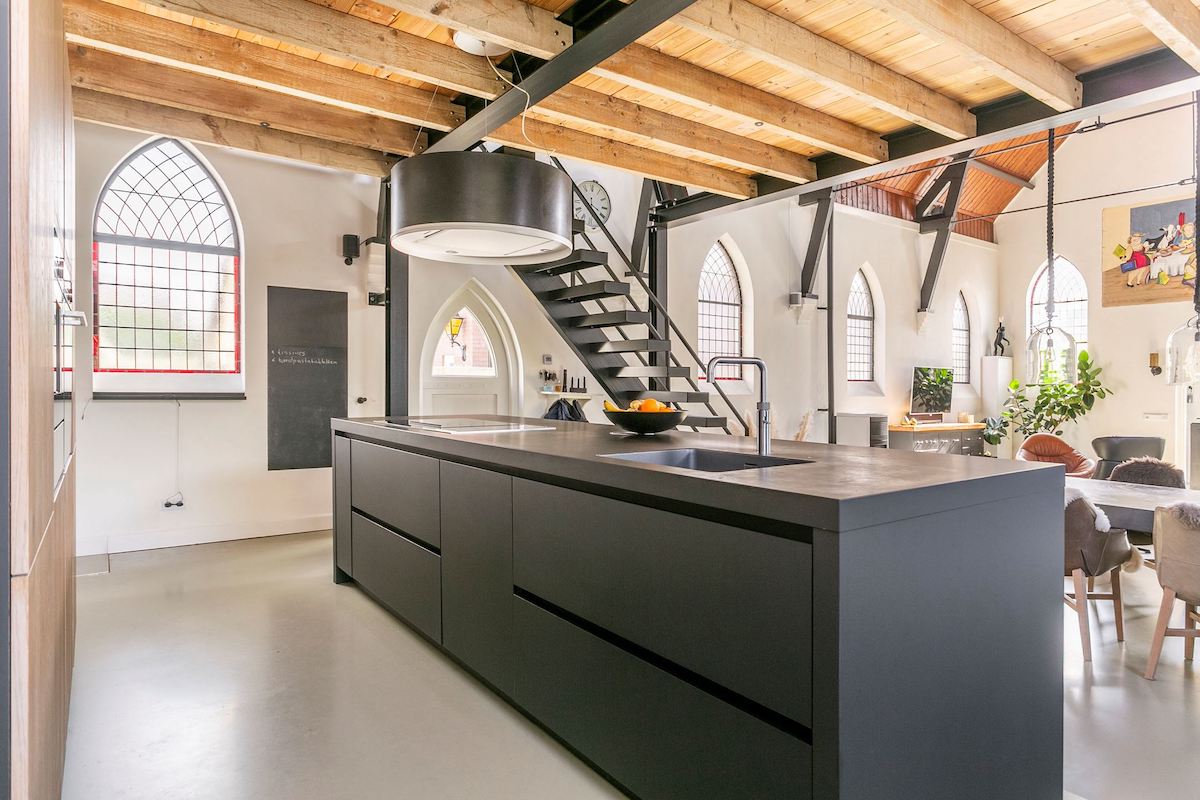 In dezelfde ruimte vind je ook de keuken. Deze keuken bevat een luxe en strak keukenblok, waar jij je heerlijk op kan uitsloven. Leuk feitje: het keukenblok is geplaatst op de plek waar eerst het altaar stond. Wanneer je aan het kokkerellen bent, heb je vanaf hier dan ook uitstekend uitzicht over de rest van de benedenverdieping.
