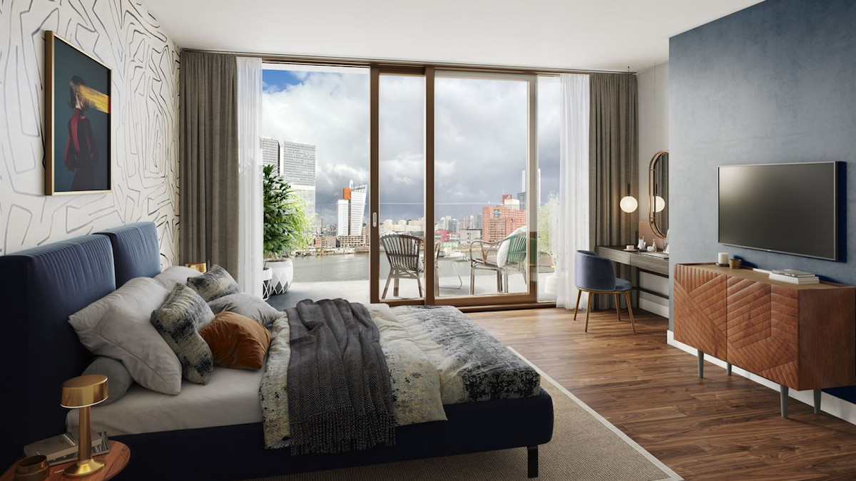 En wat een uitzicht heeft Mats Wieffer bij zijn nieuwe woning in Rotterdam! Vanaf het balkon, of vanuit bed, kan Wieffer de Rotterdamse skyline bewonderen. Voor zo’n uitzicht betaal je ook wat. De 24-jarige voetballer heeft er rond de 740.000 euro voor neergelegd. Gelukkig zit je dan op een kwartiertje fietsafstand van het trainingscomplex 1908.