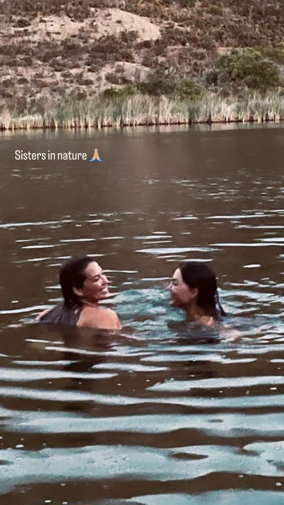 Op de Instagram Story van Yolanthe deelde ze namelijk twee foto’s waarop ze haar bikinitop heeft thuisgelaten. Samen met een van haar zussen lijkt ze een frisse ochtendduik te maken, waarschijnlijk om lekker af te koelen na een hike. Bij één van de foto’s zet ze de tekst ‘Sisters in nature’. Wat ons betreft mag ze dat zeker vaker doen! Zie hieronder de foto’s (bron: Instagram Yolanthe):